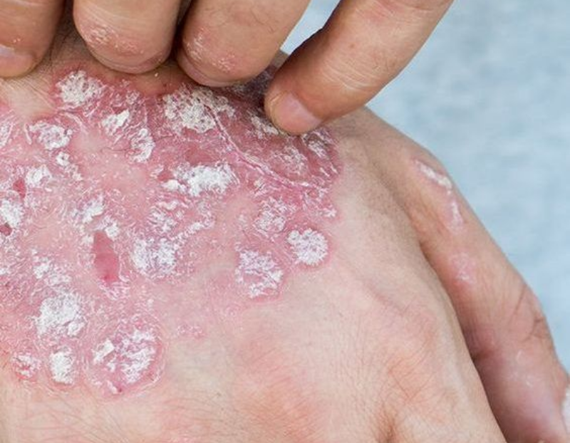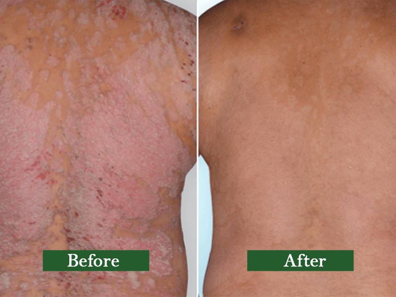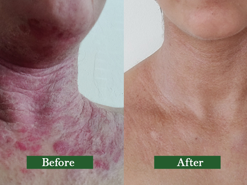 Chronic scaling and inflammation treated through Virechana + Raktamokshana to purify blood.