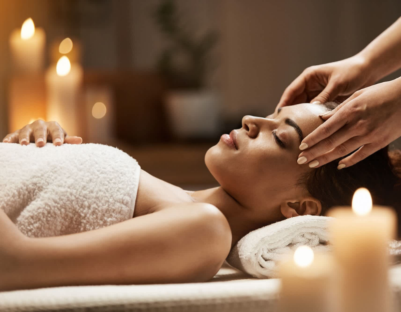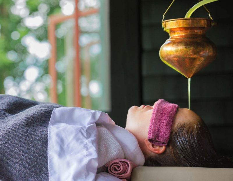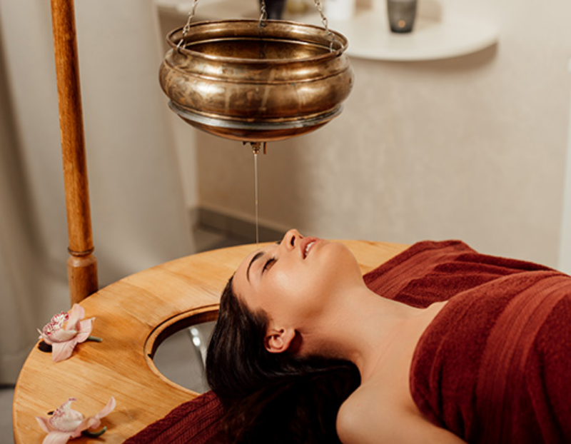 Continuous warm oil flow on forehead to reduce stress — a major trigger for skin disease flare-ups.